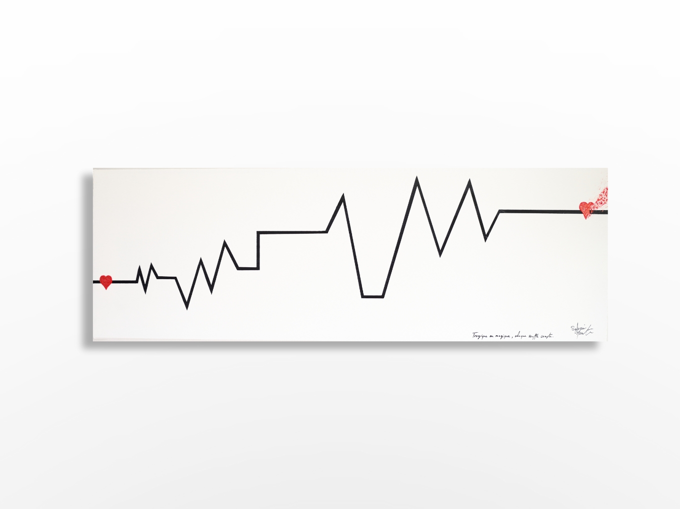 The Evolution series addresses the theme of personal progress through the years and the discovery of one’s inner world, the values that are important to us, our influences… The further one walks, the closer one gets to oneself, the more one purifies and one frees itself from the superfluous. That’s why this series is minimalist. The canvas becomes a space-time on which evolves one (or more) destiny represented by a line. Each canvas tells a story, like a book, and questions the viewer about their own existence with a handwritten thought.